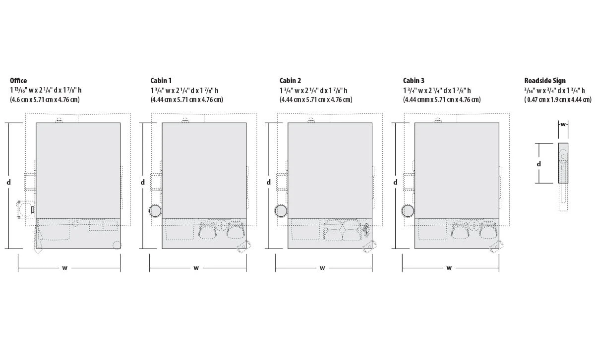 Tired travelers on your layout can check into the Moonlight Motor Court for lodging day or night. The authentically weathered and hand-painted building is pre-lit and made for use with our Just Plug® Lighting System . This traditional roadside motel has four separate buildings- an office and three rooms. The motel office and two rooms have detailed printed interiors while the third room remains unoccupied with closed curtains and a single porch light.